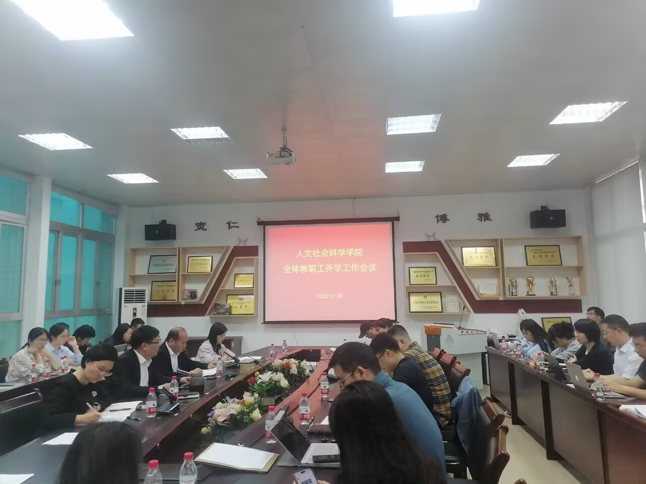2026 年 2 月 28 日,人文社会科学学院 2026 年开学工作会议在学院 206 会议室顺利召开,学院全体教职工参会,学院书记唐忠主持会议。本次会议立足新学期发展目标,总结过往经验、分享实战技巧,全面部署年度教学科研、学生管理及学院重点工作,为新学期各项工作有序开展明确方向、凝聚力量。